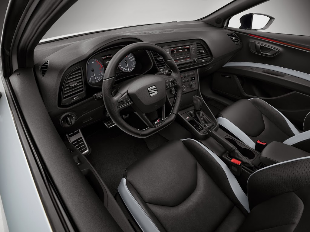 Περνώντας στο εσωτερικό, την προσοχή σίγουρα θα τραβήξει το ειδικά σχεδιασμένο, για την έκδοση Cupra, τιμόνι, το οποίο έχει δερμάτινη επένδυση και λευκές ραφές. Αυτές οι ραφές είναι ένα στοιχείο που έχει χρησιμοποιηθεί και στα sport καθίσματα τα οποία είναι ντυμένα με σκούρα γκρι Alcantara, ενώ οι υπόλοιπες ταπετσαρίες στον εσωτερικό διάκοσμο είναι δερμάτινες και σε μαύρο χρώμα. Ένα ακόμα υλικό που έχει χρησιμοποιηθεί στο εσωτερικό είναι το αλουμίνιο, με το οποίο έχουν φτιαχτεί τα πετάλια, τα χερούλια των θυρών αλλά και τα ειδικά λογότυπα Cupraπου έχουν τοποθετηθεί στη βάση των δύο εμπρός θυρών. Σχετικά με τον εξοπλισμό, το ψηφιακό ραδιόφωνο DAB συνδυάζεται με το Seat Media System Plus, ενώ παράλληλα έχουν τοποθετηθεί αισθητήρες βροχής και φώτων. Για την έκδοση Cupra 280, ο εξοπλισμός εμπλουτίζεται με δορυφορική πλοήγηση.