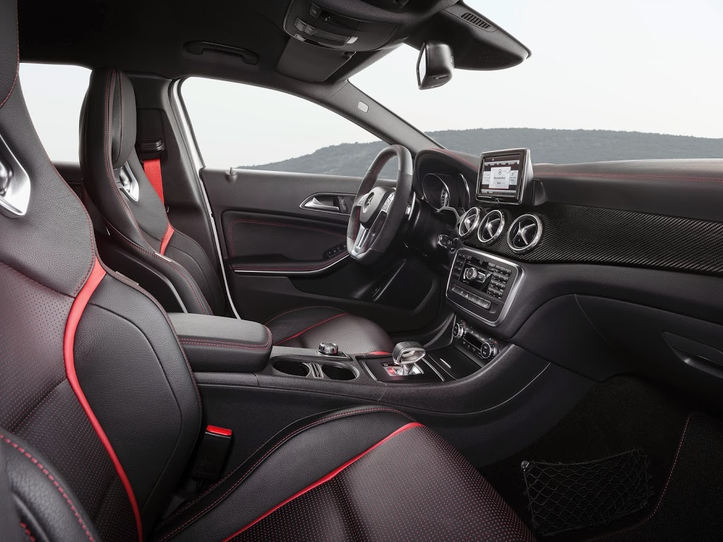 Όπως σε όλες τις AMG το εσωτερικό του GLA 45 AMG είναι υψηλής ποιότητας και σε συνδυασμό με τη σπορ αίσθηση δίνει στον οδηγό και τους επιβάτες μια διαφορετική εικόνα. Σπορ δερμάτινα καθίσματα με κόκκινες ραφές από αλκαντάρα και κόκκινες ζώνες μαζί με το τριάκτινο δερμάτινο πολυλειτουργικό σπορ τιμόνι από nappa με τις κόκκινες ραφές και τον επιλογέα ταχυτήτων στις ίδιες αποχρώσεις ολοκληρώνουν την τελειότητα του εσωτερικού. Το ταμπλό και ο πίνακας οργάνων αποτελείται από την κεντρική έγχρωμη οθόνη, παρέχοντας όλες τις πληροφορίες που χρειάζεται ο οδηγός.