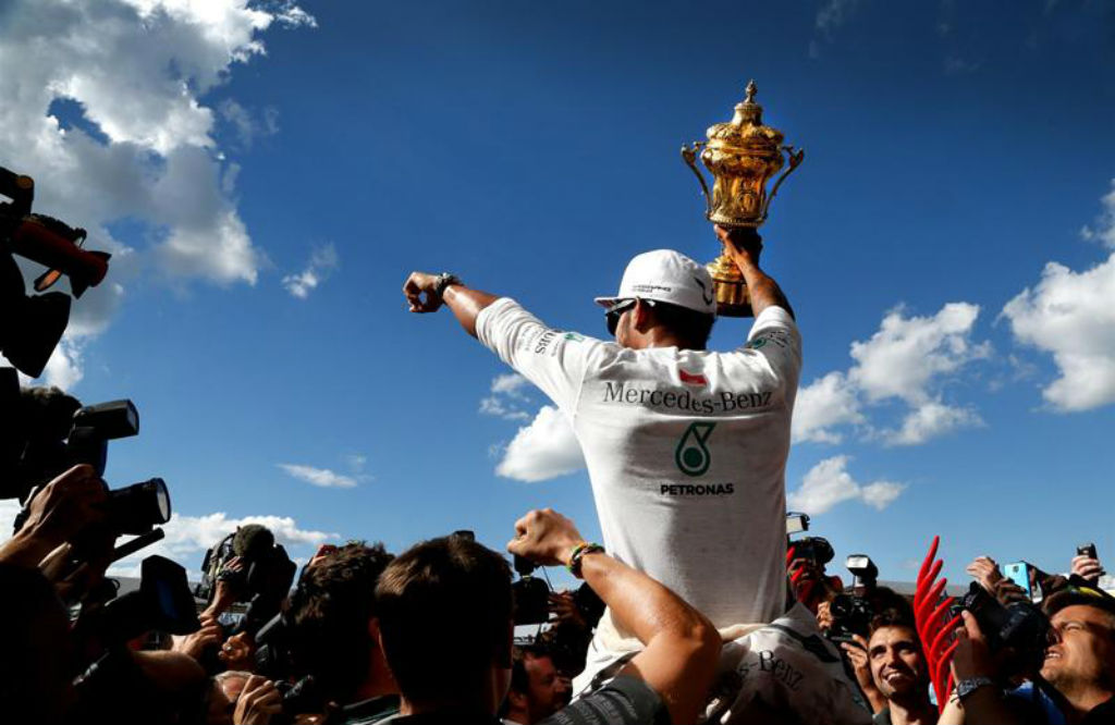 Μεγάλη Βρετανία: O Lewis Hamilton απολαμβάνει τη νίκη μέσα στην πατρίδα του σηκωμένος στα χέρια των ανθρώπων της Mercedes.