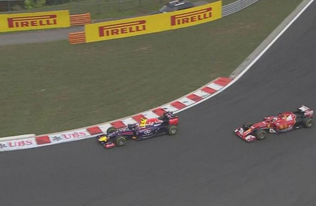 Ουγγαρία: Η Red Bull του Daniel Ricciardo περνάει σαν σταματημένη τη Ferrari του Fernando Alonso στην πίστα του Hungaroring.
