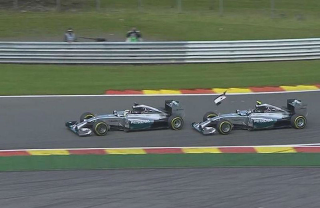 Βέλγιο: Ο Nico Rosberg έρχεται σε επαφή με τον Lewis Hamilton στην μάχη για το προβάδισμα στο Spa.