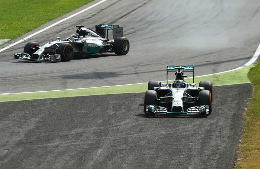 Ιταλία: Υπό πίεση, ο Nico Rosberg πηγαίνει ευθεία στο πρώτο σικέιν, επιτρέποντας στη Mercedes του Lewis Hamilton να βρεθεί στην κορυφή του αγώνα της Monza.