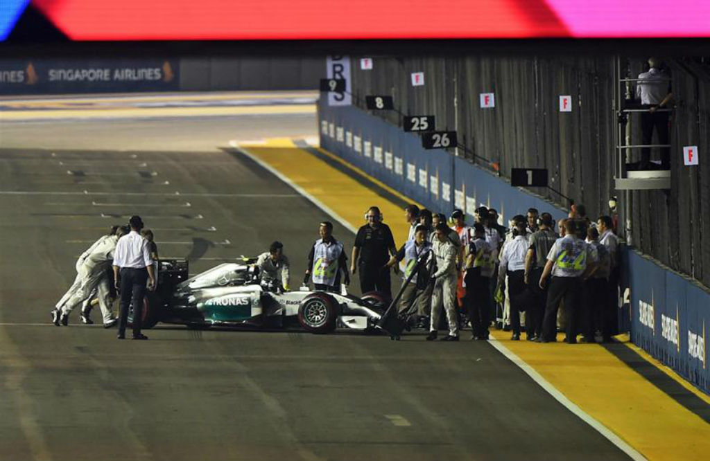 Σιγκαπούρη: Η Mercedes του Nico Rosberg μένει ακίνητη στο γύρο σχηματισμού από τα τεχνικά προβλήματα.