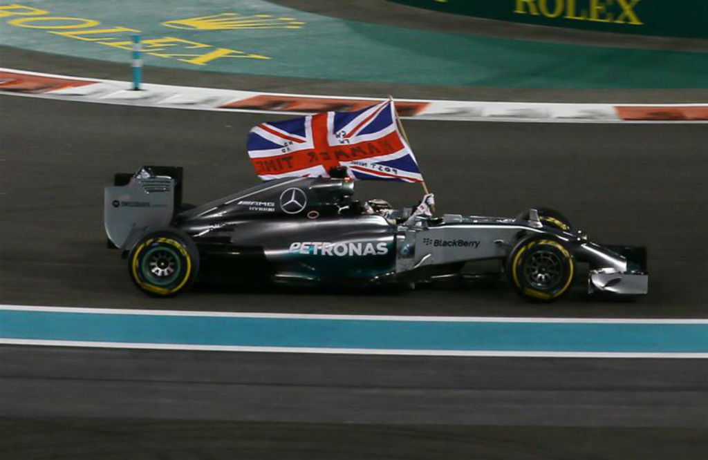 Αμπού Ντάμπι: Ο Lewis Hamilton κυματίζει τη σημαία της Βρετανίας αφού είναι ο νικητής και Παγκόσμιος Πρωταθλητής για το 2014.