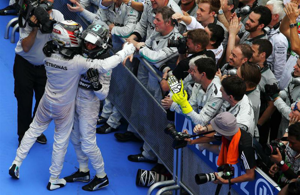 Μαλαισία: Hamilton και Rosberg αγκαλιάζονται μετά το πρώτο 1 – 2 της Mercedes για το Πρωτάθλημα.