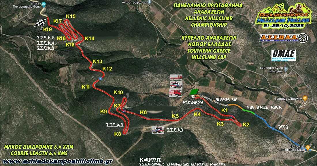 Σε όλο το μήκος της διαδρομής υπάρχει στηθαίο ασφαλείας (μπαριέρα). Η διαδρομή των 6,5 περίπου χιλιομέτρων θα γίνει το πεδίο συναγωνισμού των καλύτερων αυτοκινήτων Ανάβασης της χώρας μας. Τα pits επιστρέφουν στον όμορφο χώρο του εστιατορίου “Αρδάμης”. Η διαδρομή, απέχει περίπου 15 χιλιόμετρα από το Άργος και 35 χιλιόμετρα από την Τρίπολη. Έχει πολύ και ασφαλή χώρο παρακολούθησης για τους θεατές, τους οποίους παρακαλούμε θερμά να ακολουθούν τις υποδείξεις των ανθρώπων της οργάνωσης. Θέλουμε να ευχαριστήσουμε ιδιαίτερα τον Δήμο του Άργους-Μυκηνών για την βοήθεια τους στον αγώνα μας.