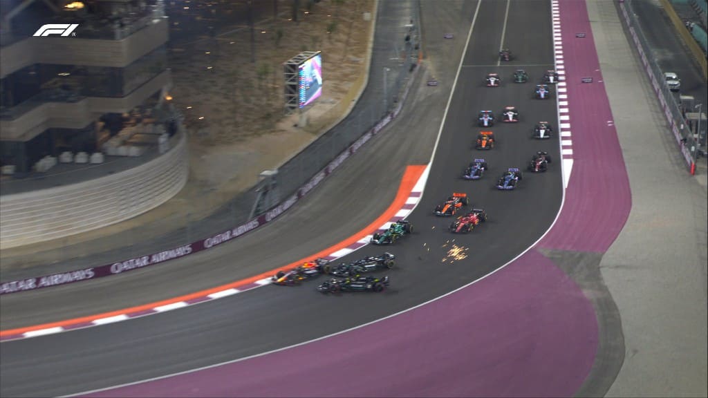 Ο Russell τη γλύτωσε φτάνοντας στα pit stop, ενώ την ίδια ώρα είχαμε αυτοκίνητο ασφαλείας. Ο Hamilton στην πορεία ξαναβλέποντας την επαφή ανέλαβε 100% την ευθύνη του συμβάντος. Την ίδια ώρα ο Bottas είχε μια επαφή πιο πίσω αποκτώντας μια σπασμένη αεροτομή. Στον 4ο γύρο μπήκε στα pit ο Stroll, ενώ στον 5ο γύρο είχαμε και πάλι αγώνα. Με αυτά όλα στην κορυφή ήταν ο Verstappen, ενώ ακολουθούσαν οι Piastri, Alonso και Leclerc. Στον 6ο γύρο ο Russell πέρασε τον Perez ανεβαίνοντας στην 13η θέση, ενώ την ίδια ώρα ο Hulkenberg δεχόταν ποινή 10”.