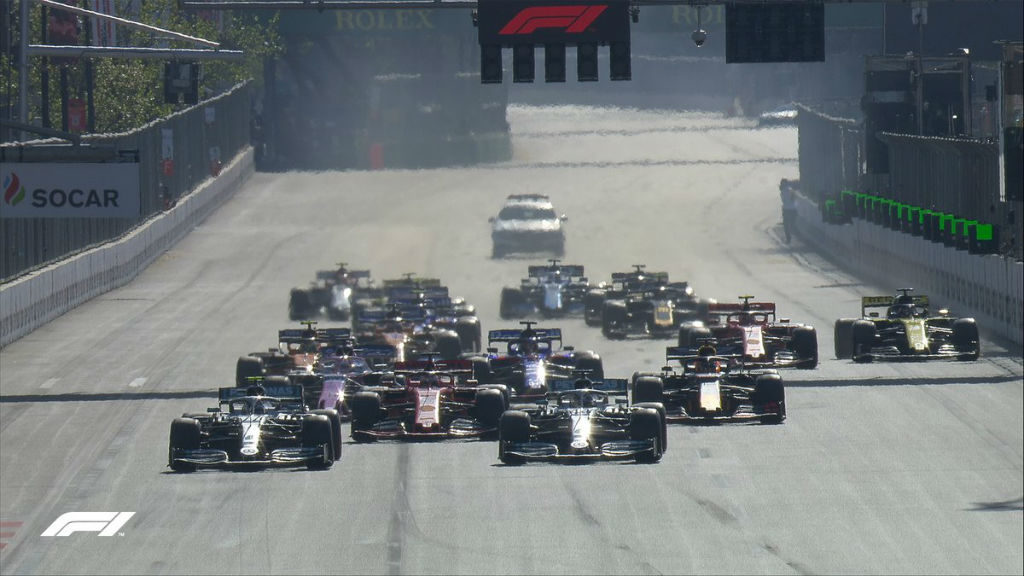 Σβήνοντας τα 5 κόκκινα φώτα ο Hamilton πήγε να κάνει ότι και στον προηγούμενο αγώνα παίρνοντας την εσωτερική στη στροφή από τον Valtteri Bottas, όμως αυτή τη φορά ο Φιλανδός άντεξε στην πίεση του Βρετανού κρατώντας έτσι την πρώτη θέση. Στις πίσω θέσεις ο Norris κέρδιζε μια θέση, ενώ ο Leclerc από 9ος έπεφτε μια θέση. Ο Bottas αμέσως άνοιξε τη διαφορά στα 2”, ενώ το ίδιο έκανε και ο Hamilton που είχε πίσω του τον Vettel.