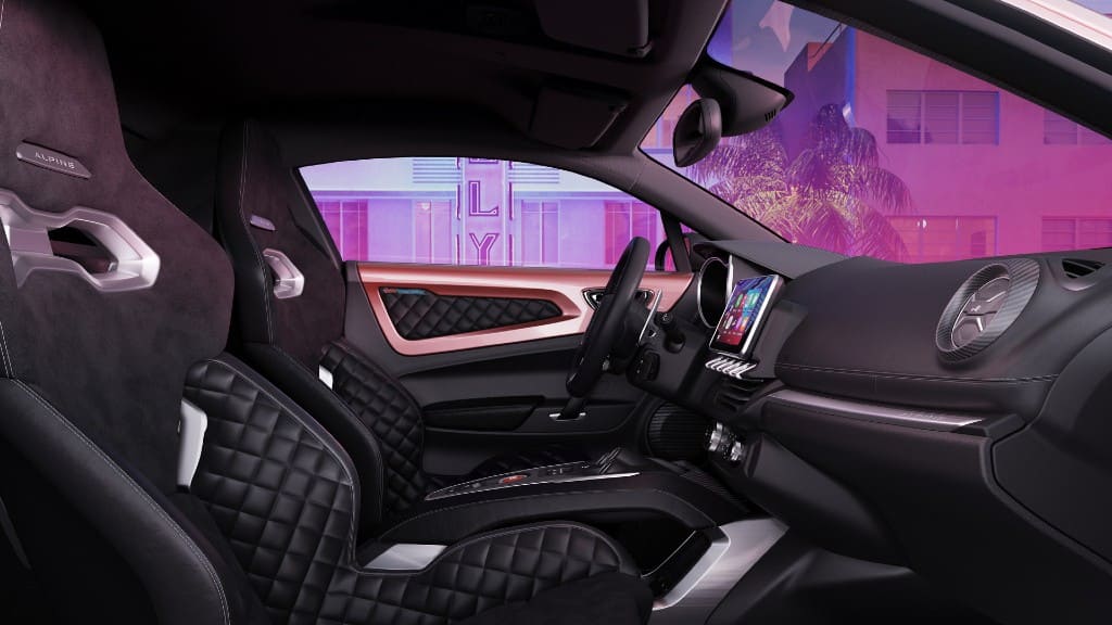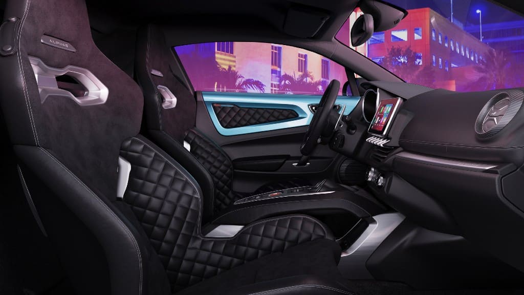 Τα δύο αυτά χρώματα είναι ιστορικά για την Alpine, αφού τα βλέπουμε και στο μονοθέσιο της εταιρείας στη Formula 1. Και τα δύο χρώματα συνδυάζονται με τις λευκές ζάντες αλουμινίου μεγέθους 18”. Στο εσωτερικό βρίσκουμε τα δερμάτινα bucket καθίσματα με τις γκρι ραφές, τη δερμάτινη επένδυση της κεντρικής κονσόλας, τα ειδικά πατάκια και φυσικά τις γαλάζιες ή ροζ πινελιές.