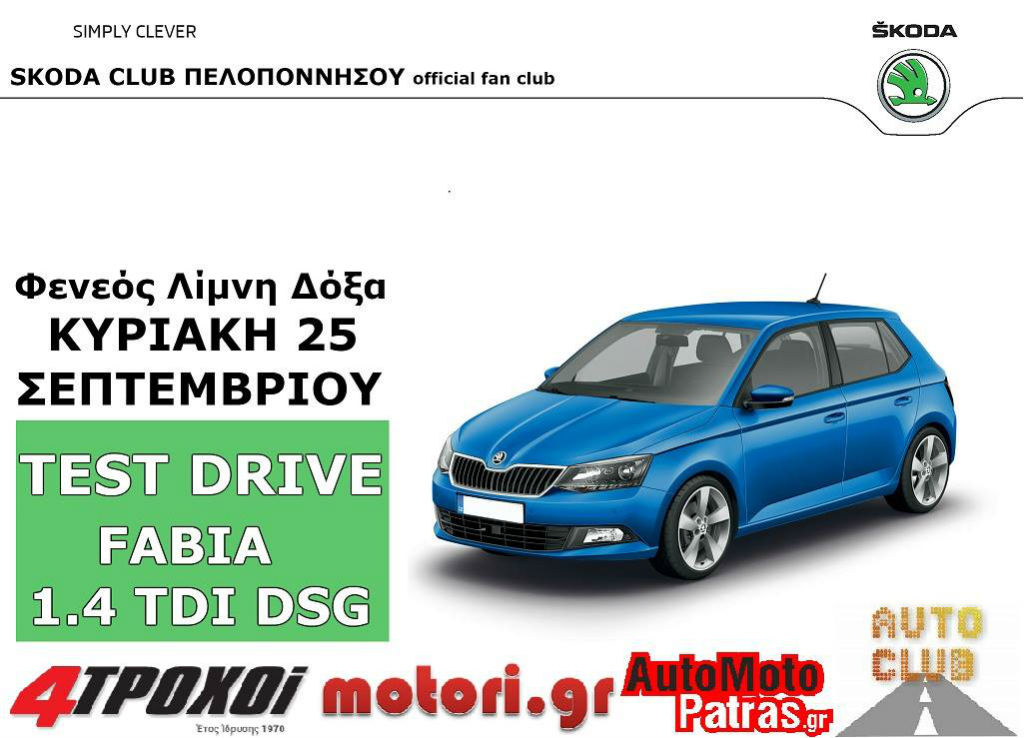 Την Κυριακή 25 Σεπτεμβρίου το Skoda Club Peloponnhsou θα κάνει μια ξεχωριστή εκδρομή στην Λίμνη Δόξα στο Φενεό στην Ορεινή Κορινθία, σε μια διαδρομή και περιοχή απαράμιλλης ομορφιάς. Εκτός από την όμορφη βόλτα θα έχουμε την ευκαιρία να δούμε από κοντά και να οδηγήσουμε την νέα Fabia 1.4 Diesel με κιβώτιο DSG, ένα μοντέλο που θέλαμε πολύ να οδηγήσουμε, σε ένα ξεχωριστό test γύρο από την λίμνη.