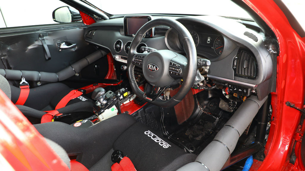 Στο εσωτερικό και εδώ έχουν αφαιρεθεί πράγματα για τη μείωση του βάρους όπως τα πίσω καθίσματα και το ηχοσύστημα. Τα bucket καθίσματα της Recaro με τις ζώνες τεσσάρων σημείων, τα roll cage, ο πυροσβεστήρας, η μπαταρία Lite Blox LiPo και η αφαίρεση της ρεζέρβας προσφέρουν ένα καθαρά αγωνιστικό αυτοκίνητο, αλλά και 22 κιλά πιο χαμηλό σε βάρος.