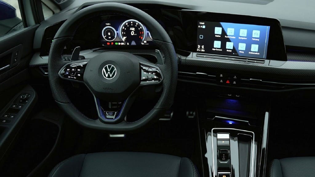 Στο εσωτερικό υπάρχουν κομμάτια από ανθρακονήματα στο ταμπλό και τις επενδύσεις. Φυσικά και εδώ όπως σε όλα τα Golf R υπάρχουν τα λογότυπα R που το κάνουν να ξεχωρίζει αμέσως. Τα δερμάτινα καθίσματα με τις μαύρες ραφές, το δερμάτινο τριάκτινο τιμόνι με τα χειριστήρια και τα πεντάλ αλουμινίου ανεβάζουν τον πήχη της πολυτέλειας. Ο επιλογέας ταχυτήτων είναι τόσο μικρός που αλλάζει τα πάντα σε σχέση με ότι γνωρίζουμε, ενώ υπάρχουν και τα paddle shift πίσω από το τιμόνι.