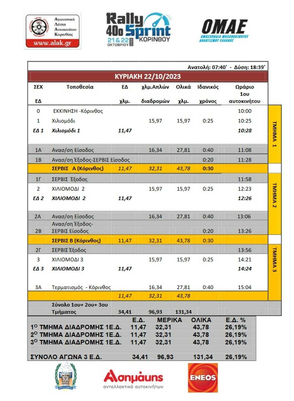 Η Αγωνιστική Λέσχη Αυτοκινήτου Κορινθίας διοργανώνει το Σαββατοκύριακο 21 και 22 Οκτώβρη 2023 το 40ο Rally Sprint Κορίνθου (Χωμάτινο) που προσμετρά στο Κύπελλο Χωμάτινων Rally 2023 σύμφωνα με το αγωνιστικό πρόγραμμα της ΟΜΑΕ. Το Δ.Σ της Λέσχης και η Οργανωτική Επιτροπή αποφάσισε ο αγώνας να γίνει στην ειδική διαδρομή Χιλιομόδι, όπως έγινε και στο 38ο Rally Sprint. Η ειδική αυτή πήρε τις καλύτερες κριτικές στην αξιολόγηση από τα πληρώματα που συμμετείχαν στον αγώνα.