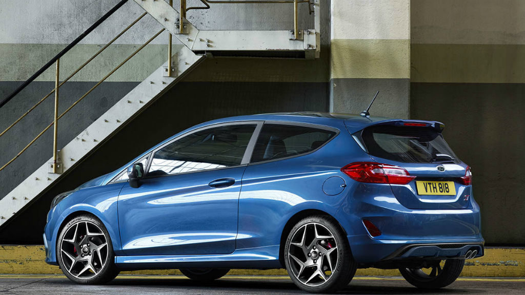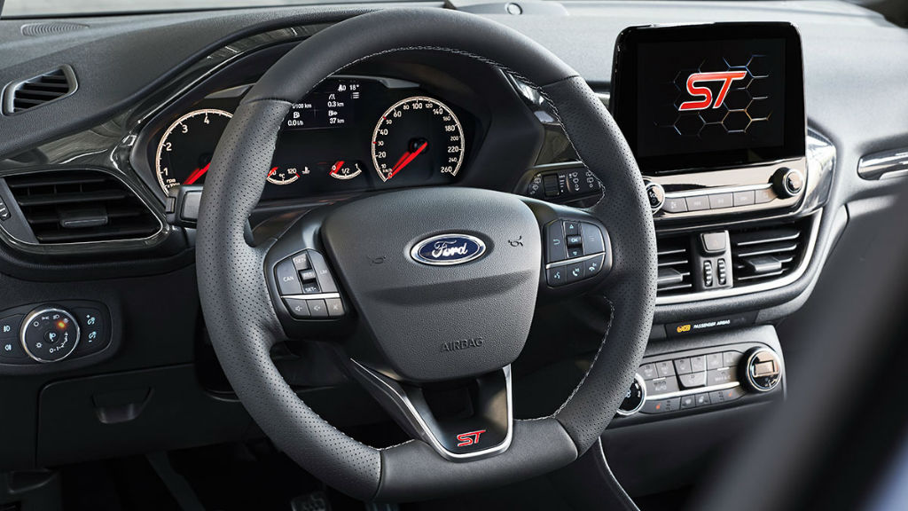 Στο βασικό εξοπλισμό το νέο Ford Fiesta ST προσφέρει 6 αερόσακους, A/C, ESC, Cruise Control, δερμάτινο τιμόνι Flat Bottom, δερμάτινο επιλογέα ταχυτήτων και δερμάτινο μοχλό χειρόφρενου με γκρι ραφή, σπορ καθίσματα Recaro, ρυθμιζόμενα καθίσματα οδηγού και συνοδηγού, σύστημα εκκίνησης χωρίς κλειδί, προβολείς αλογόνου εστιασμένης δέσμης με φώτα ημέρας LED, πίσω LED φωτιστικά σώματα, αυτόματους προβολείς, προβολείς ομίχλης, ηλεκτρικά θερμαινόμενους εξωτερικούς καθρέπτες, μεγάλο πίσω σπόιλερ και ποδιά, δύο χρωμιωμένες απολήξεις εξάτμισης, υποβοήθηση διατήρησης λωρίδας με προειδοποίηση, ρυθμιζόμενο σύστημα περιορισμού ταχύτητας, υποβοήθηση εκκίνησης στην ανηφόρα, ανάρτηση ST με πίσω ελατήρια ανακατανομής πλευρικών δυνάμεων, ηχοσύστημα SYNC3 με έγχρωμη οθόνη αφής 6,5″, Bluetooth με φωνητικό έλεγχο, κλήση έκτακτης ανάγκης, AppLink, θύρες USB και ζάντες ελαφρού κράματος Flash Grey μεγέθους 17″ με διαστάσεις ελαστικών 205/45.