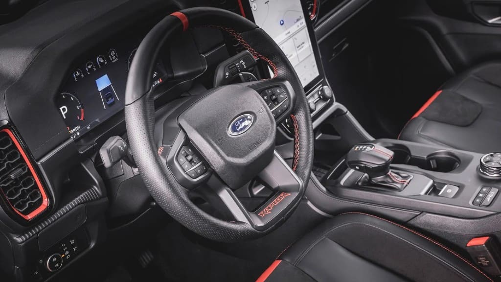Εξωτερικά ξεχωρίζει η μεγάλη μάσκα και τα τεράστια γράμματα “Ford”, που συνδυάζονται άψογα με τα LED φωτιστικά σώματα και τα φώτα ημέρας LED σε σχήμα C. Οι νευρώσεις στο καπό θέλουν να κάνουν πιο άγρια την εμφάνιση, ενώ στο πίσω μέρος βλέπουμε το σήμα της Ford και τα λογότυπα Raptor και Ranger, με το τελευταίο να είναι ανάγλυφο στην πίσω πόρτα. Επιπλέον, τα LED φωτιστικά σώματα και στο πίσω μέρος είναι εντυπωσιακά δίνοντας μια άλλη αίσθηση. Το αμάξωμα ολοκληρώνεται με τις μαύρες ζάντες αλουμινίου μεγέθους 17”.