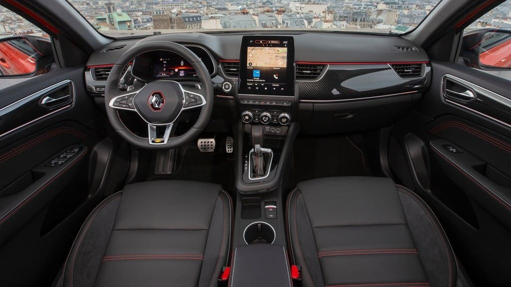 Στο εσωτερικό ξεχωρίζουν οι δύο ψηφιακές οθόνες, μια για τον πίνακα οργάνων και μια κάθετη αφής για το σύστημα ενημέρωσης και ψυχαγωγίας. Τα σπορ καθίσματα είναι από δέρμα και σουέτ και διαθέτουν κόκκινες ραφές. Το δερμάτινο τριάκτινο τιμόνι με τα χειριστήρια και το λογότυπο R.S., ο δερμάτινος επιλογέας ταχυτήτων και τα πεντάλ αλουμινίου ανεβάζουν τον πήχη της πολυτέλειας.
