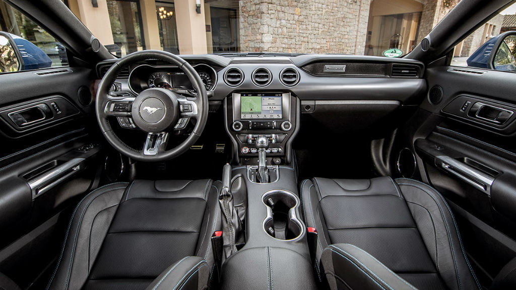 Επιπλέον υπάρχει AdvanceTrac με ηλεκτρονικό σύστημα ευστάθειας (ESC), Hill Launch Assist, Burn Out, εφαρμογή μέτρησης επιδόσεων, σύστημα αποτροπής σύγκρουσης, κάμερα οπισθοπορείας, σύστημα προειδοποίησης αλλαγής λωρίδας και υποβοήθησης διατήρησης λωρίδας, σύστημα παρακολούθησης της πίεσης ελαστικών, αυτόματοι προβολείς και υαλοκαθαριστήρες με αισθητήρα βροχής, ηλεκτρικά ρυθμιζόμενοι, θερμαινόμενοι και αναδιπλούμενοι εξωτερικοί καθρέπτες, φωτοχρωματικός εσωτερικός καθρέπτης, φώτα εδάφους που προβάλουν το σήμα της Mustang, πίσω αισθητήρες στάθμευσης, ηχοσύστημα με 9 ηχεία, Bluetooth υποδοχές παιδικού καθίσματος ISOFIX και ζάντες αλουμινίου μεγέθους 19”.