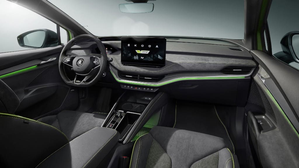Η νέα Skoda Enyaq RS iV διαθέτει τα Full LED Matrix φωτιστικά σώματα εμπρός και τα LED πίσω, καθώς και τις μαύρες ζάντες αλουμινίου Taurus μεγέθους 20”. Προαιρετικά υπάρχουν και οι ζάντες αλουμινίου Vision μεγέθους 21”. Στο εσωτερικό δεσπόζουν τα δερμάτινα σπορ καθίσματα από Alcantara με τις πράσινες ραφές, ενώ υπάρχει και η οθόνη αφής μεγέθους 13”, με το σύστημα ενημέρωσης και ψυχαγωγίας. Το δερμάτινο τριάκτινο τιμόνι με τα χειριστήρια διαθέτει το λογότυπο RS ανεβάζοντας τον πήχη της πολυτέλειας.