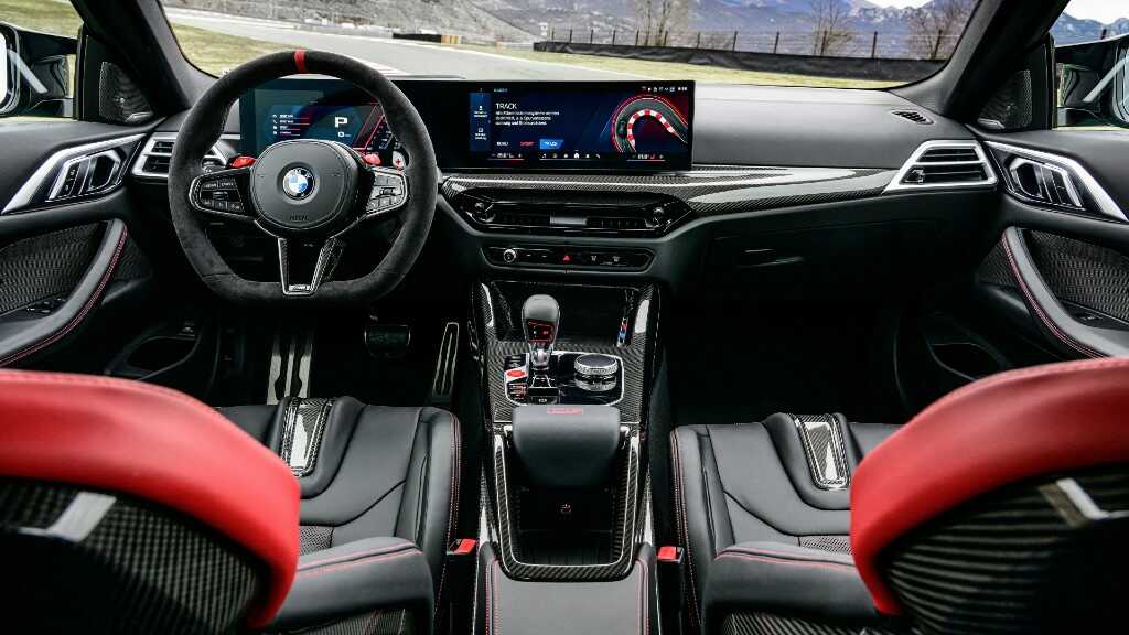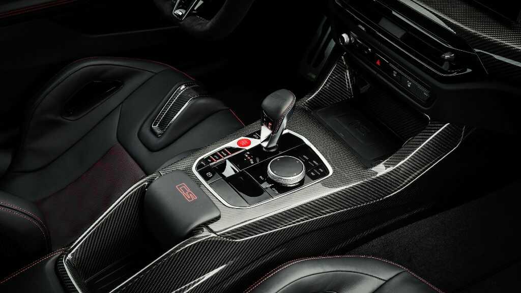 Στο εσωτερικό ξεχωρίζουν αμέσως τα μαύρα-κόκκινα bucket M Carbon καθίσματα από δέρμα Merino. Επιπλέον, υπάρχει η κυρτή ψηφιακή οθόνη, η οποία χωρίζεται σε δύο κομμάτια, μια για τον πίνακα οργάνων μεγέθους 12,3” και μια μεγέθους 14,9”, με το σύστημα ενημέρωσης και ψυχαγωγίας. Το δερμάτινο τριάκτινο τιμόνι με τα χειριστήρια, ο δερμάτινος επιλογέας ταχυτήτων και τα πεντάλ αλουμινίου ανεβάζουν τον πήχη της πολυτέλειας, ενώ πίσω από τα τιμόνι υπάρχουν τα paddle shift για πιο γρήγορες αλλαγές ταχυτήτων.