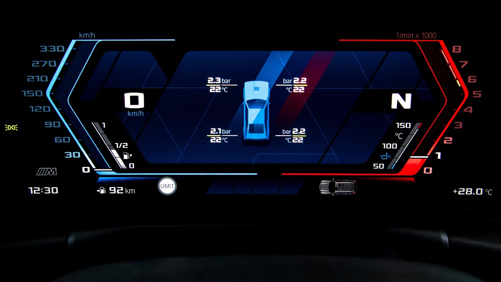 Στο εσωτερικό ξεχωρίζουν αμέσως οι δύο ψηφιακές οθόνης. Πρόκειται για την οθόνη του πίνακα οργάνων μεγέθους 12,3” και μια αφής μεγέθους 14,9”, με το σύστημα ενημέρωσης και ψυχαγωγίας. Τα σπορ δερμάτινα καθίσματα από Sensatec/Alcantara, το δερμάτινο τριάκτινο τιμόνι με τα χειριστήρια ο δερμάτινος επιλογέας ταχυτήτων και τα πεντάλ αλουμινίου ανεβάζουν τον πήχη της πολυτέλειας.