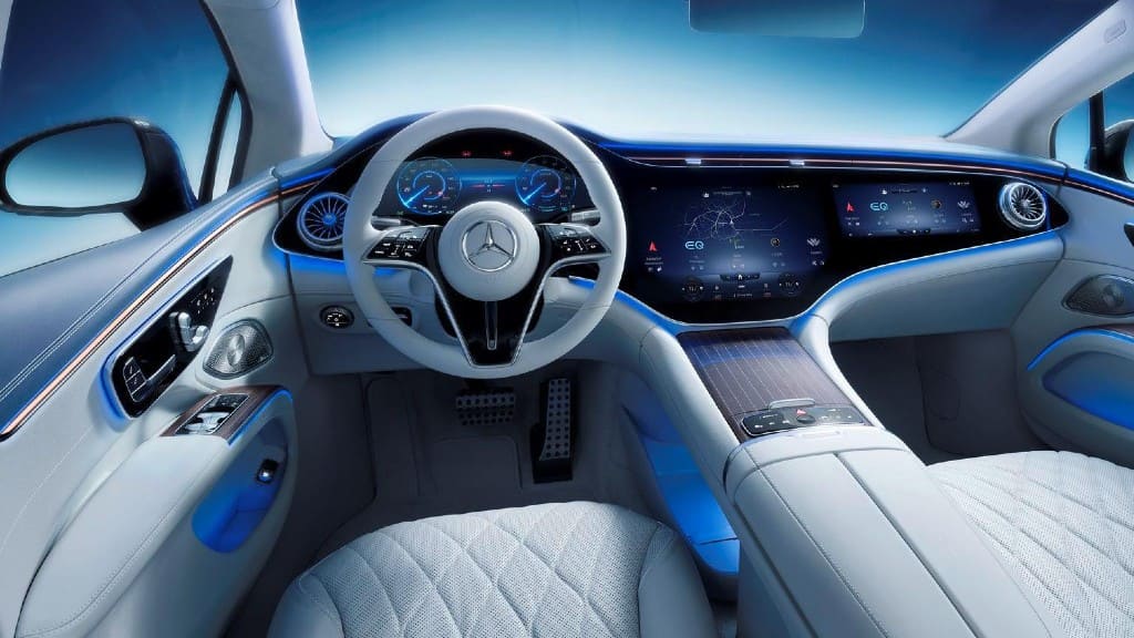 Επιπλέον, υπάρχει η head-up display οθόνη για να μην αποσπάται η προσοχή του οδηγού από το δρόμο και δύο οθόνες μεγέθους 12,3”, για του πίσω επιβάτες. Το σύστημα ενημέρωσης και ψυχαγωγίας MBUX Hyperscreen διαθέτει τον 8πύρηνο επεξεργαστή και 24GB RAM, ενώ υπάρχει για την καλύτερη αναπνοή των επιβατών το φίλτρο αέρα HEPA που φιλτράρει τον εξωτερικό αέρα που εισέρχεται στην καμπίνα. Επιπλέον, υπάρχει και κρυφός ατμοσφαιρικός φωτισμός.