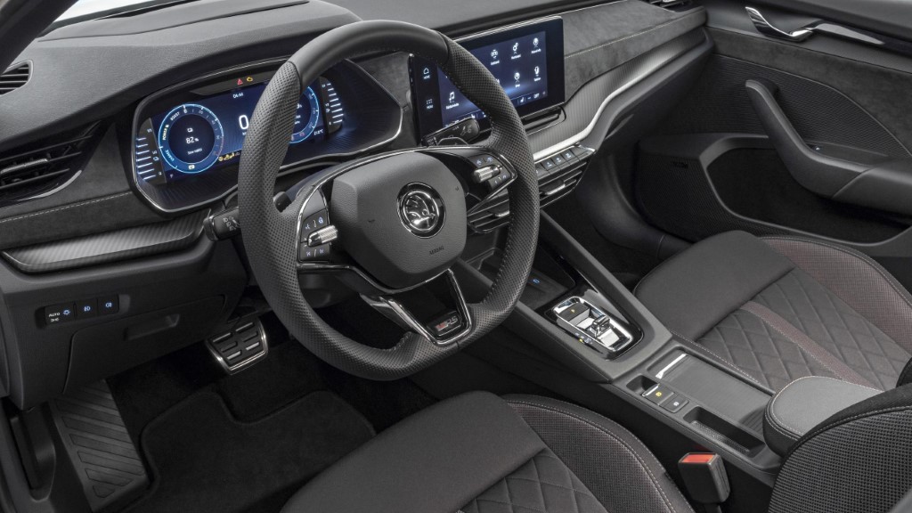 Στο εσωτερικό ξεχωρίζουν τα μαύρα δερμάτινα καθίσματα από Alcantara με τις κόκκινες ραφές, το τριάκτινο δερμάτινο τιμόνι με τα χειριστήρια και το λογότυπο vRS, καθώς και ο διαφορετικός επιλογέας ταχυτήτων. Η σπορ αίσθηση συμπληρώνεται από τα πεντάλ αλουμινίου και από το λογότυπο vRS που βρίσκεται και στα καθίσματα. Το ταμπλό διαθέτει δύο οθόνες μια για τον πίνακα οργάνων και μια αφής για το σύστημα ενημέρωσης και ψυχαγωγίας, οι οποίες διαθέτουν λευκό και μπλε φωτισμό δημιουργώντας ένα ζεστό περιβάλλον.