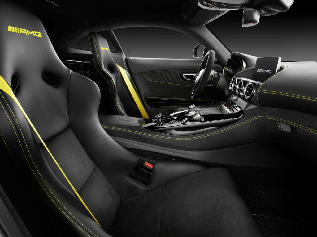 Στο εσωτερικό της νέας AMG GT R οι συνθήκες είναι ιδανικές. Εξαιρετικά ελαφριά, χειροκίνητα ρυθμιζόμενα AMG σπορ bucket καθίσματα, επενδεδυμένα με δέρμα nappa και DINAMICA μικροΐνες κάνουν τον οδηγό να αισθάνεται άνετα. Προσφέρουν την απαραίτητη πλευρική στήριξη ακόμα και σε ακραίους ελιγμούς οδήγησης. Οι προαιρετικές κίτρινες ζώνες ασφαλείας, και το ταμπλό με τις κίτρινες αποχρώσεις δίνουν μια άλλη αίσθηση. Το σχήμα της κεντρικής κονσόλας θυμίζει κατευθείαν μοντέλο από το μηχανοκίνητο αθλητισμό.