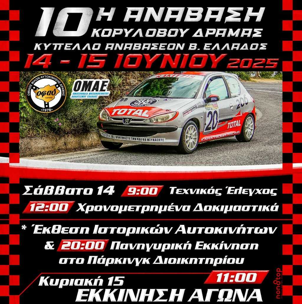 Ο Όμιλος Φίλων Αυτοκίνησης Δράμας (ΟΦΑΔ) ανακοινώνει με ενθουσιασμό τη διεξαγωγή της 10ης Ανάβασης Κορύλοβου Δράμας, που θα πραγματοποιηθεί το Σαββατοκύριακο 14-15 Ιουνίου 2025 στη Δράμα. Ένας αγώνας-θεσμός για το ελληνικό Motorsport, που κάθε χρόνο συγκεντρώνει κορυφαίους οδηγούς και έντονο συναγωνισμό σε μια διαδρομή που συνδυάζει απαιτητική οδήγηση και μοναδικό φυσικό τοπίο. Στον αγώνα δήλωσαν συμμετοχή 39 οδηγοί.
