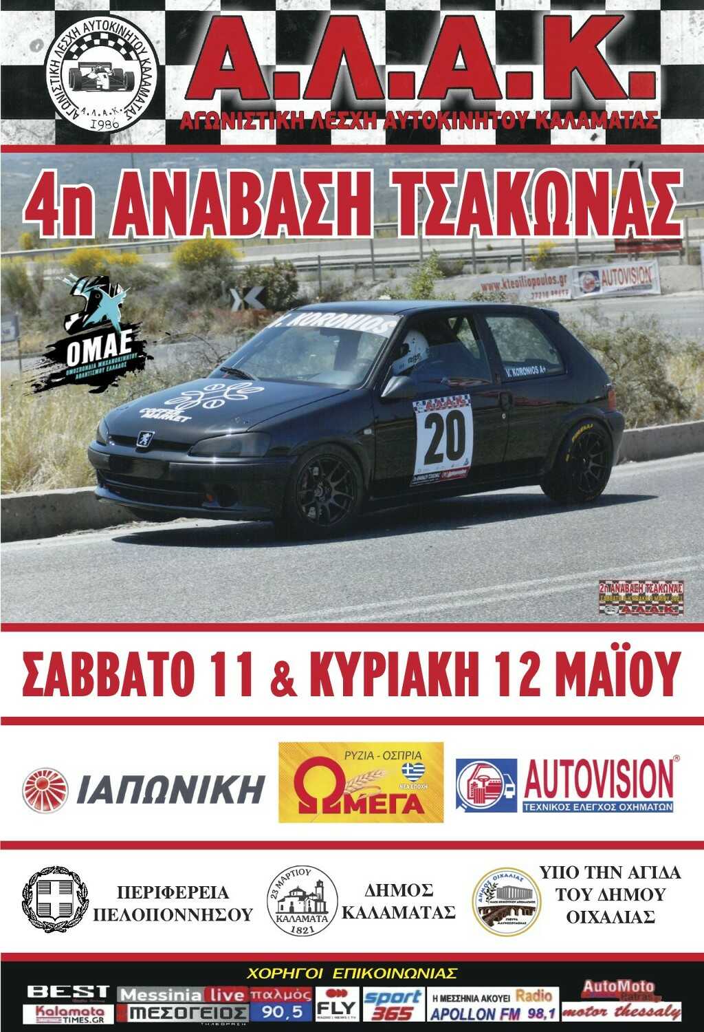 Έφτασε η ώρα για τη μεγάλη διοργάνωση μηχανοκίνητου αθλητισμού στη Μεσσηνία. Το Σαββατοκύριακο η Αγωνιστική Λέσχη Αυτοκινήτου Καλαμάτας θα διοργανώσει την 4η Ανάβαση Τσακώνας 2024, η οποία θα πραγματοποιηθεί με 37 συμμετοχές. Ο αγώνας, που γίνεται πλέον θεσμός, υπόσχεται θέαμα και συγκινήσεις ενώ προσμετρά στο Πανελλήνιο Κύπελλο Αναβάσεων Νοτίου Ελλάδος.