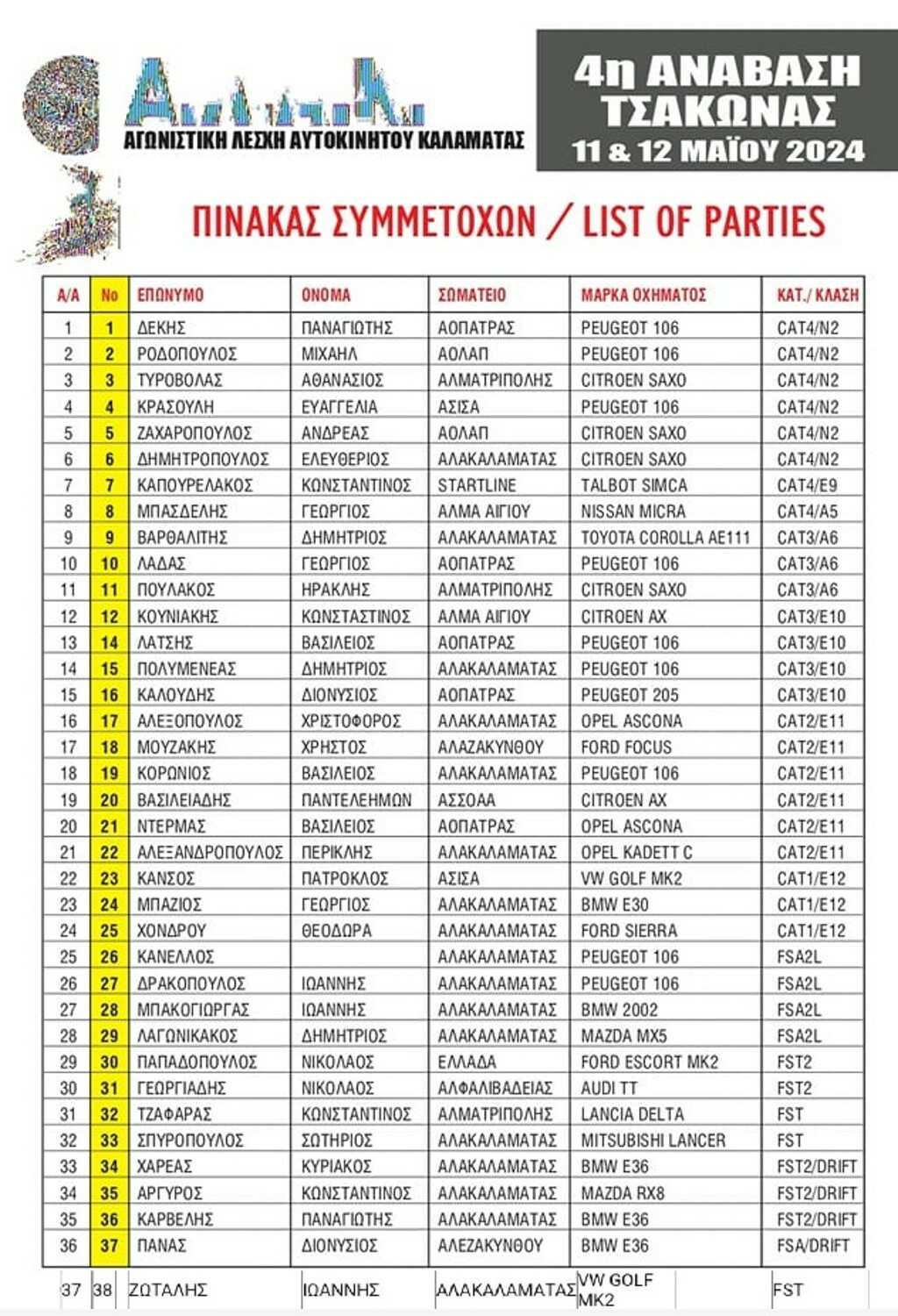 Οι συμμετοχές της 4ης Ανάβασης Τσακώνας 2024