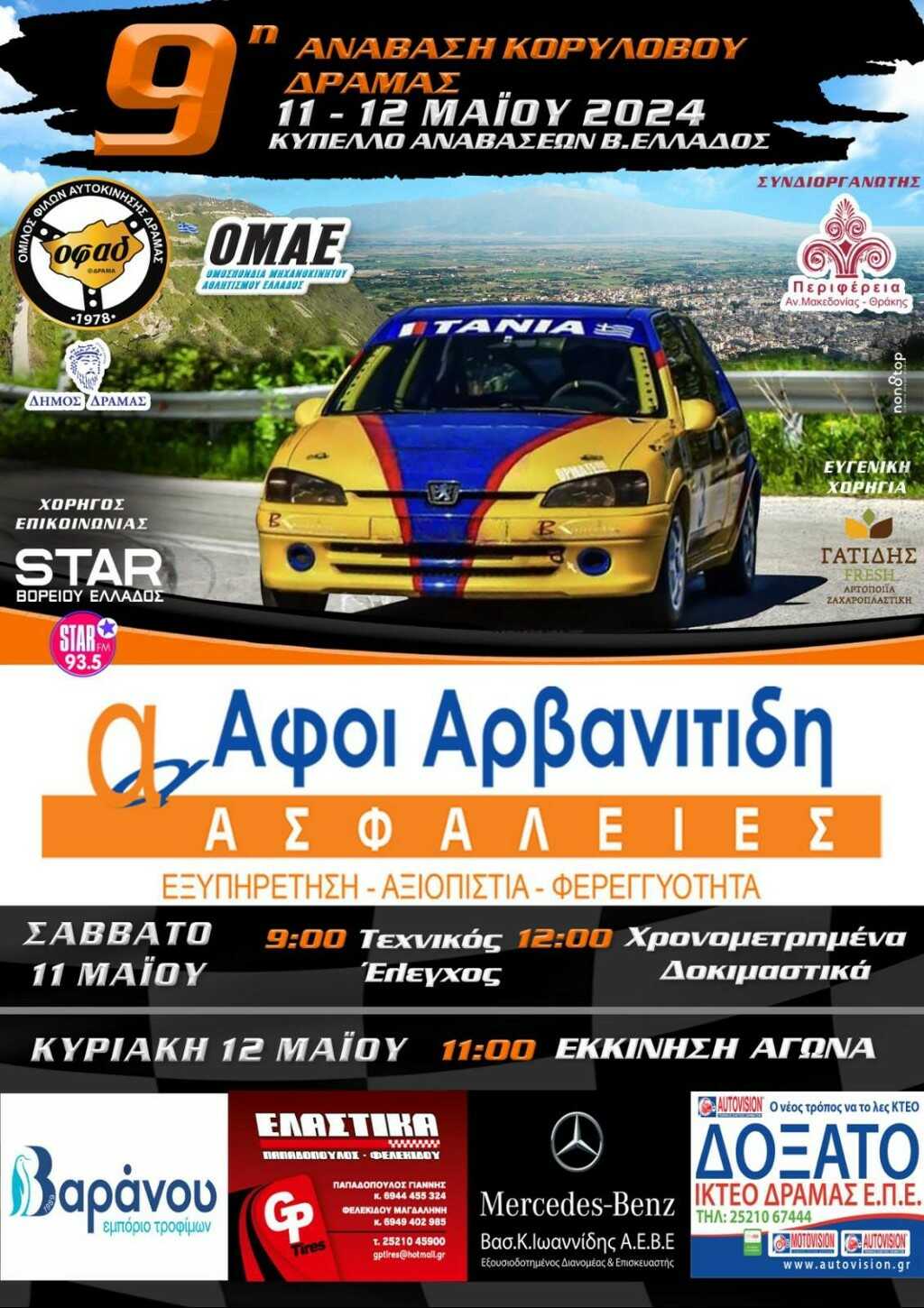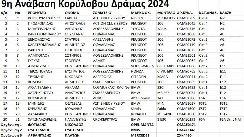 Με 20 συμμετοχές θα διεξαχθεί στις 11 και 12 Μαΐου η 9η Ανάβαση Κορύλοβου Δράμας 2024, αγώνας που προσμετράει στο Κύπελλο Αναβάσεων Βορείου Ελλάδος. Οι συμμετοχές της 9ης Ανάβασης Κορύλοβου Δράμας 2024 Είδαν το άρθρο 2.604 Σχετικά Πλοήγηση άρθρων 11ο Rally Sprint Αιγίου 2024 45ο Η&Κ ΑΕΒΕ Rally Κρήτης 2024
