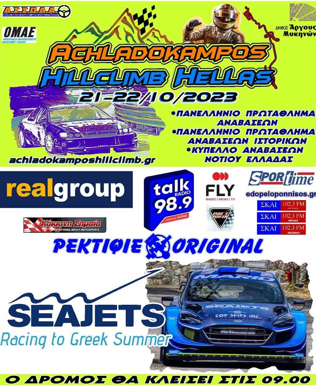 Να ευχαριστήσουμε θερμά τους θεσμικούς χορηγούς μας, τον Δήμο Άργους Μυκηνών, τους δύο χορηγούς του αγώνα μας SEAJETS και ΡΕΚΤΙΦΙΕ ΟΡΙΤΖΙΝΑΛ και τέλος τους χορηγούς επικοινωνίας: talkradio 989, real fm, σκαι, edopeloponnisos.gr, kokkinhshmaia.gr, sportime, fly και engine power και όλους όσοι με την αρωγή και την βοήθεια τους, συντελούν στην διεξαγωγή του αγώνα μας. Ραντεβού λοιπόν το Σαββατοκύριακο 21-22 Οκτωβρίου στον Αχλαδόκαμπο για το απόλυτο θέαμα.