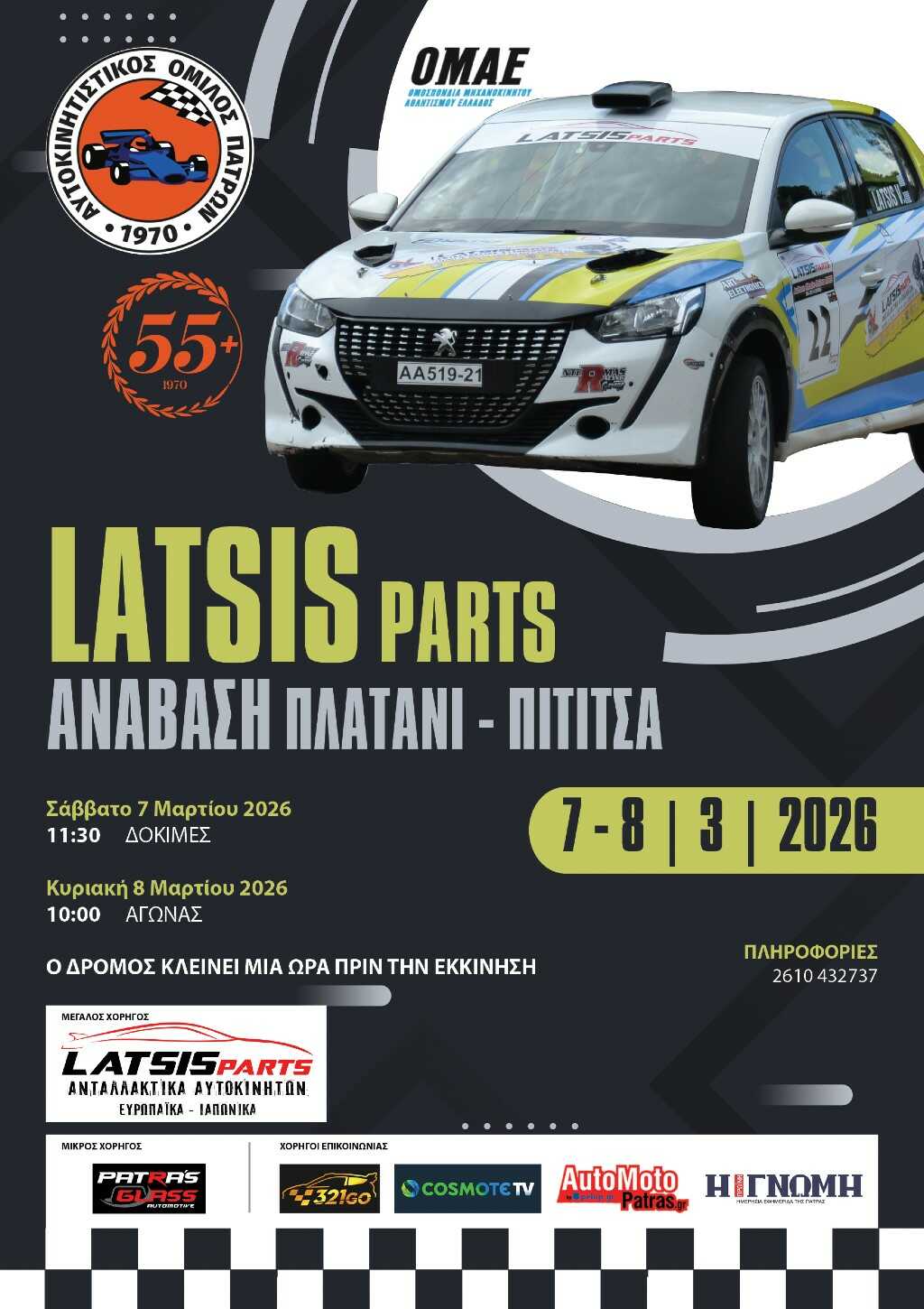 Η Πάτρα και ο Αυτοκινητιστικός Όμιλος Πατρών υποδέχονται τον πρώτο γύρο του Πανελλήνιου Πρωταθλήματος Αναβάσεων, του Πανελλήνιου Πρωταθλήματος Αναβάσεων Ιστορικών Αυτοκινήτων και του Κυπέλου Αναβάσεων Νοτίου Ελλάδος για το 2026. Το Σάββατο και την Κυριακή 7 και 8 Μαρτίου 2026 αντίστοιχα, ο Α.Ο.Π. διοργανώνει για άλλη μια φορά την Latsis Parts Ανάβαση Πλατάνι-Πιτίτσα 2026, στην ομώνυμη ιστορική διαδρομή.