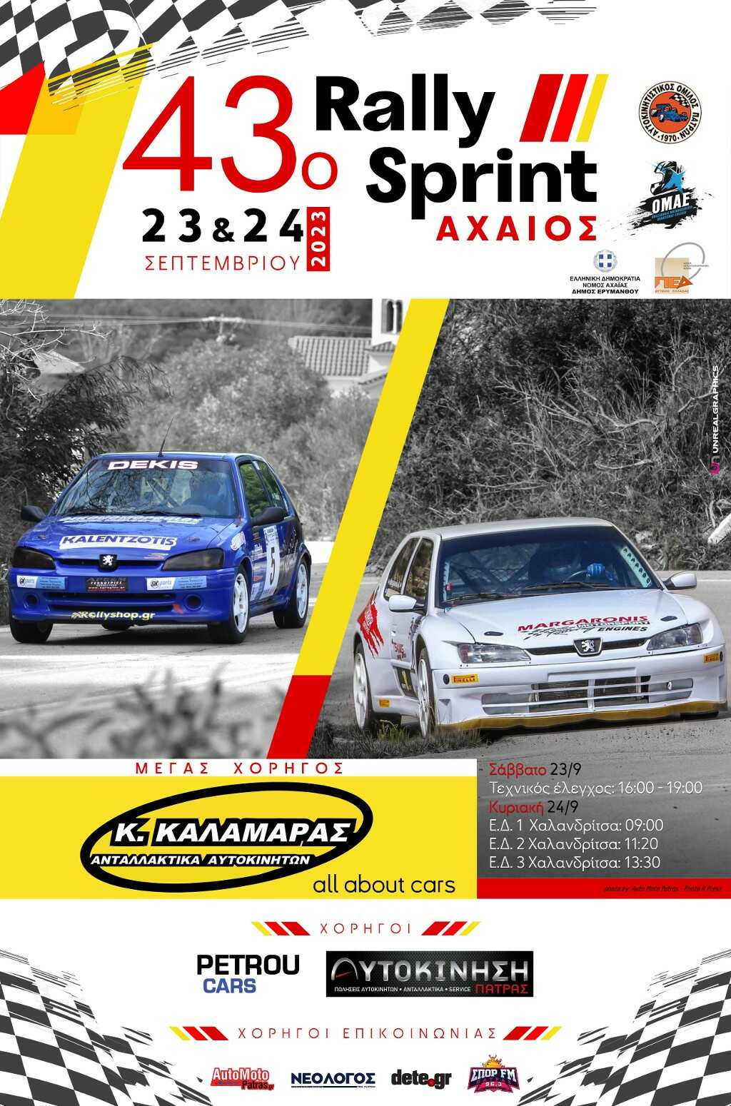 Το Σάββατο και την Κυριακή 23-24 Σεπτεμβρίου 2023 ο Αυτοκινητιστικός Όμιλος Πατρών (ΑΟΠ) διοργανώνει τον αγώνα “43ο Rally Αχαιός”, με συνδιοργανωτή την Περιφερειακή Ένωση Δήμων (Π.Ε.Δ.) Δυτικής Ελλάδος, που προσμετρά στο Κύπελο Rally Ασφάλτου Νοτίου Ελλάδας και Πρωτάθλημα Ασφάλτου Ιστορικών Αυτοκινήτων, όπως έχουν προκηρυχθεί από την Ομοσπονδία Μηχανοκίνητου Αθλητισμού Ελλάδος.