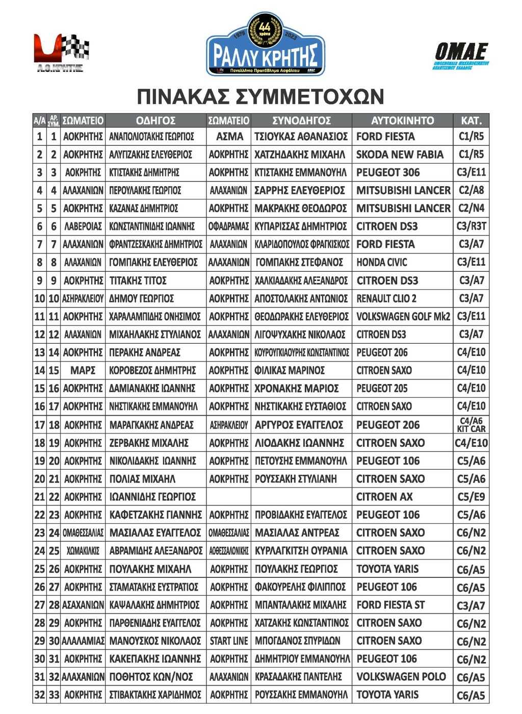 Με 32 συμμετοχές θα διεξαχθεί το 44ο Η&Κ ΑΕΒΕ Rally Κρήτης στις 21 και 22 Οκτωβρίου από τον ΑΟΚρήτης. Οι συμμετοχές του 44ου Η&Κ ΑΕΒΕ Rally Κρήτης 2023 Είδαν το άρθρο 879 Σχετικά Πλοήγηση άρθρων Οι συμμετοχές του 40ου Rally Sprint Κορίνθου 2023 Το νέο Hyundai Ioniq 6 από 49.490€