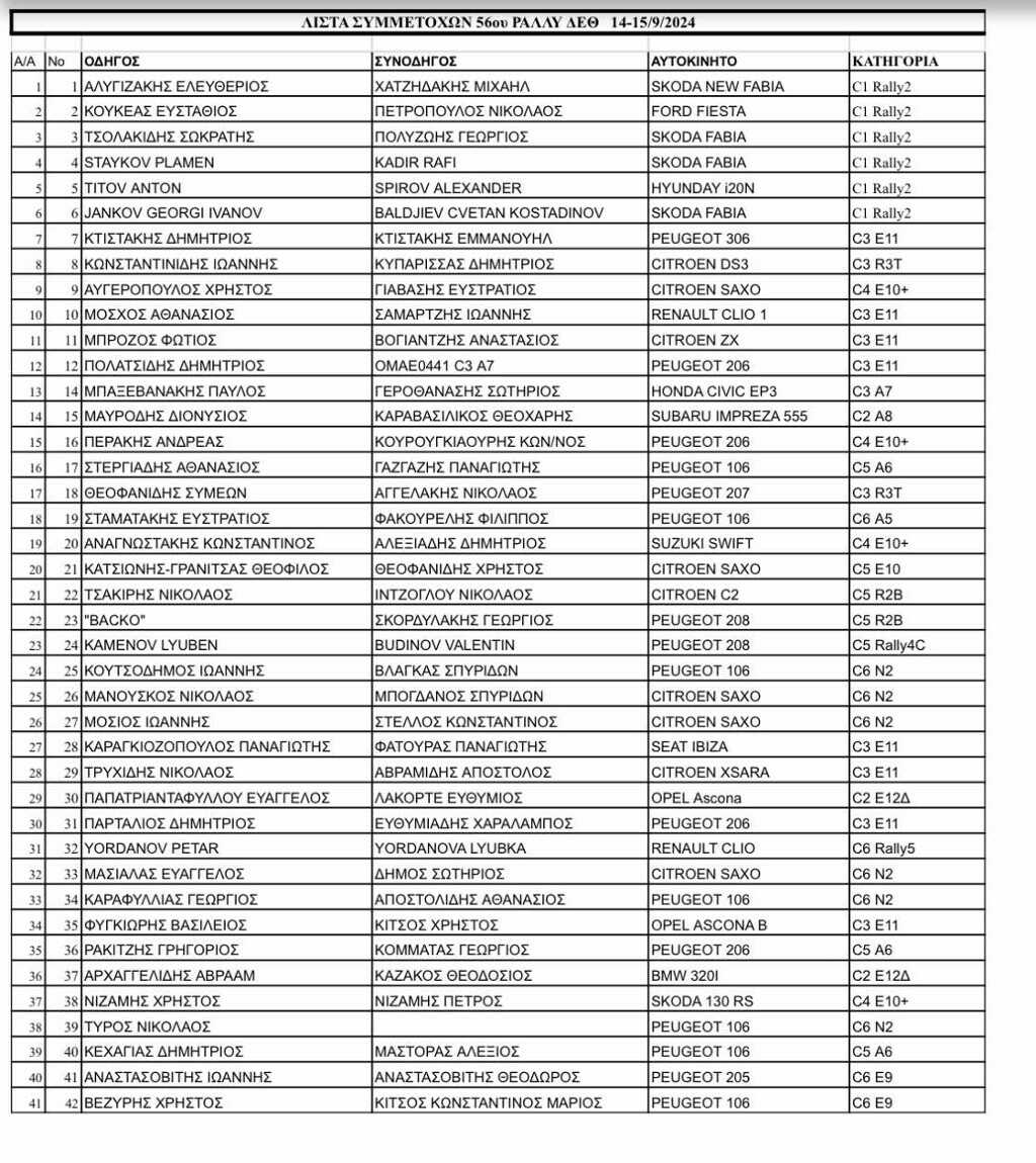 Οι συμμετοχές του 56ου Rally Δ.Ε.Θ. 2024