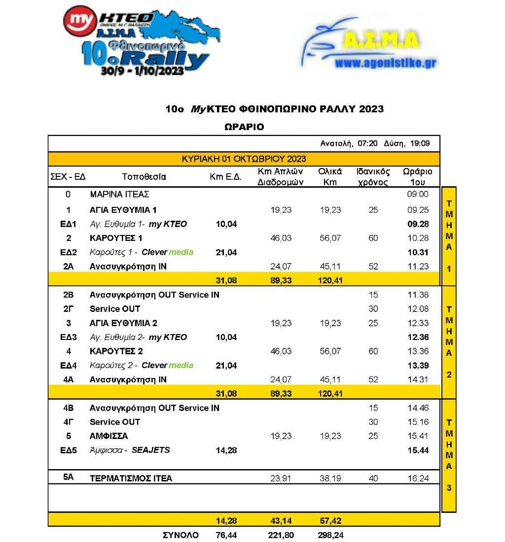 Τα πληρώματα θα εξέλθουν στις 09:00 από το Service Park που θα φιλοξενείται στη Μαρίνα της Ιτέας και θα κατευθυνθούν στις Ειδικές Διαδρομές “Αγία Ευθυμία” (10,04 χιλιόμετρα) και “Καρούτες” (21,04 χιλιόμετρα). Έπειτα από το μεσημεριανό Service, οι αγωνιζόμενοι θα επιστρέψουν για το δεύτερο πέρασμα από τις Ειδικές Διαδρομές “Αγία Ευθυμία” και “Καρούτες”. Power Stage του αγώνα είναι η Ειδική Διαδρομή “Άμφισσα”, μήκους 14,28 χιλιομέτρων, η οποία θα ολοκληρώσει το myKTEO 10ο Φθινοπωρινό Rally. Μετά από 76 αγωνιστικά χιλιόμετρα και 298 συνολικά, τα πληρώματα θα τερματίσουν στην Κεντρική Προβλήτα της Ιτέας στις 16:24. Οι απονομές των επάθλων θα γίνουν στις 18:00 στον ίδιο χώρο.