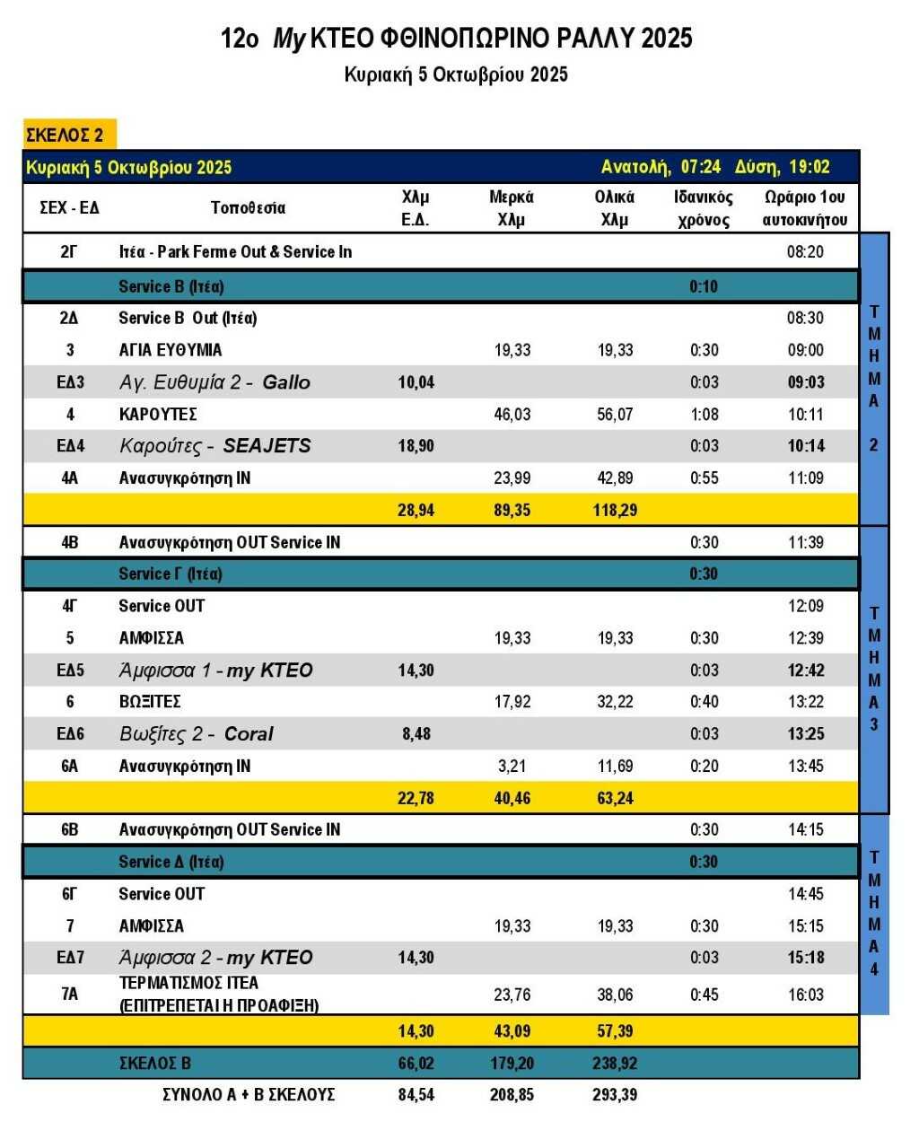Το δεύτερο σκέλος του myKTEO 12ου Φθινοπωρινού Rally 2025 απαρτίζεται από 5 Ειδικές Διαδρομές. Πρώτη διαδρομή της ημέρας και τρίτη του αγώνα θα είναι η “Αγία Ευθυμία 2-Gallo”, μήκους 10,04 χιλιομέτρων, με ώρα έναρξης 09:03. Στις 10:14 τα πληρώματα θα αγωνιστούν στην Ειδική Διαδρομή “Καρούτες-Seajets”, μήκους 18,90 χιλιομέτρων και θα επιστρέψουν στην Ιτέα για 30λεπτο Service.