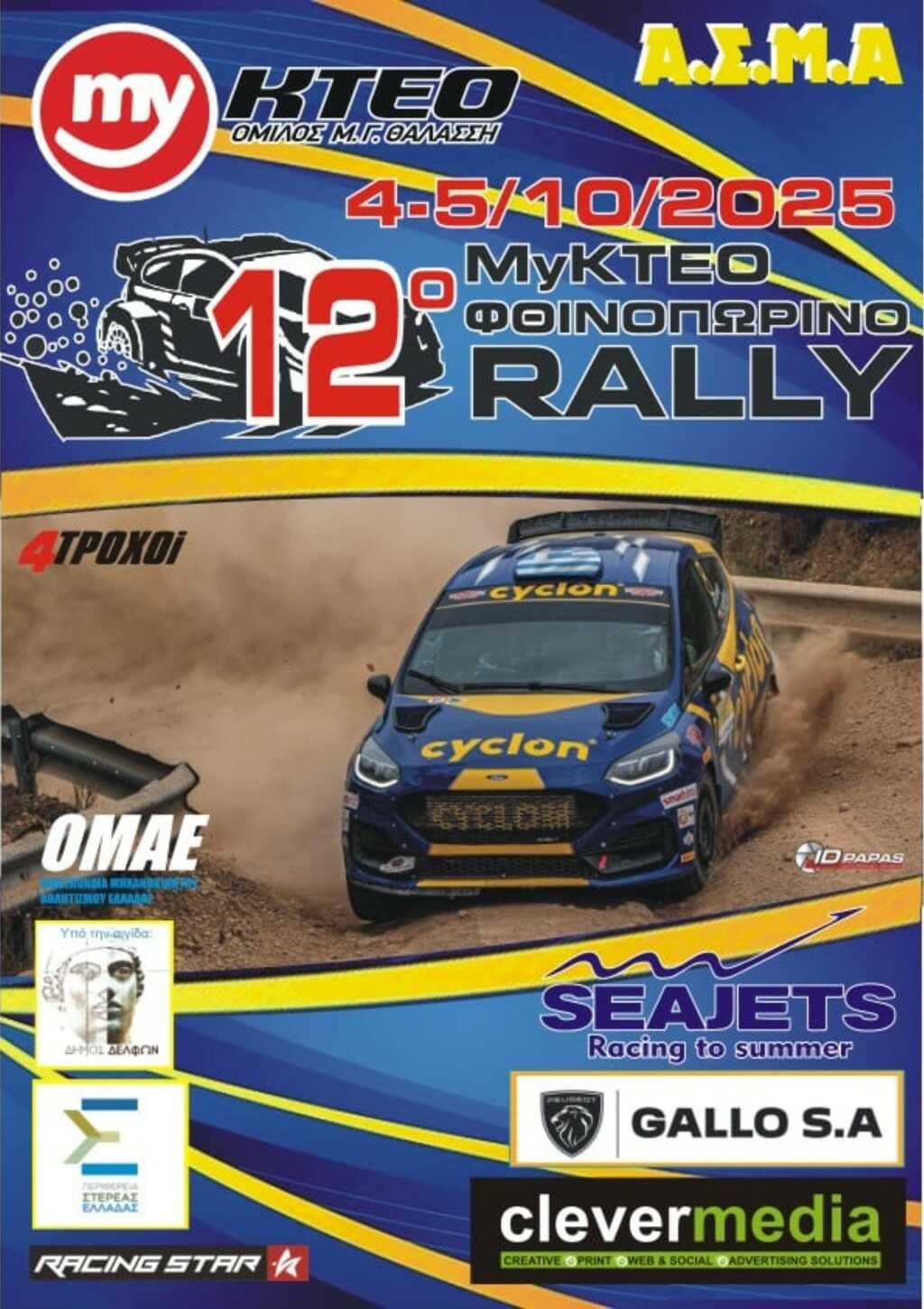 Το Πανελλήνιο Πρωτάθλημα Rally Χώματος συνεχίζεται με το myKTEO 12ο Φθινοπωρινό Rally 2025, το οποίο θα διεξαχθεί το διήμερο 4 και 5 Οκτωβρίου. Ο τρίτος γύρος του θεσμού συγκέντρωσε το ενδιαφέρον 48 πληρωμάτων που θα αναμετρηθούν σε 7 απαιτητικές Ειδικές Διαδρομές συνολικού μήκους 84,54 αγωνιστικών χιλιομέτρων. Τη διοργάνωση έχει αναλάβει το Αγωνιστικό Σωματείο Μηχανοκίνητου Αθλητισμού (Α.Σ.Μ.Α.), έχοντας την πολύτιμη στήριξη της Περιφέρειας Στερεάς Ελλάδας και του Δήμου Δελφών.