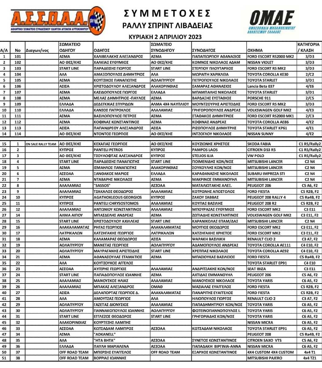 Οι συμμετοχές του Rally Sprint Λιβαδειάς 2023