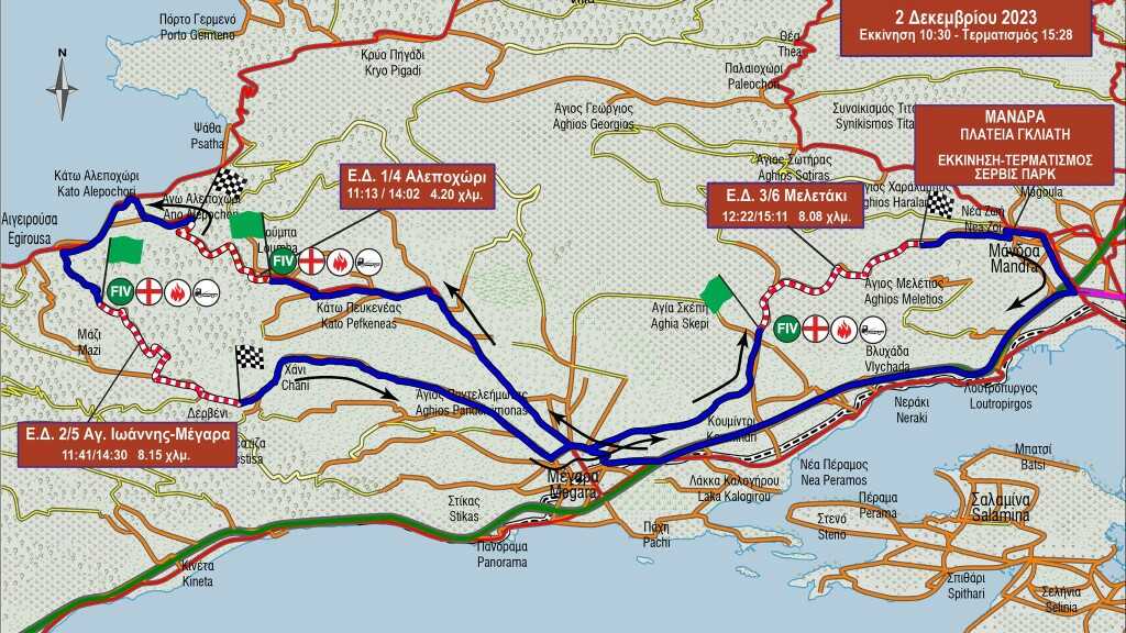 Την Παρασκευή 1 Δεκεμβρίου στην τοποθεσία MR KTEO, Πειραιώς 29-31, Μοσχάτο Αττικής θα πραγματοποιηθεί ο διοικητικός και τεχνικός έλεγχος του αγώνα (ώρα 18:30-21:30), ενώ το Service Park και το Park Ferme θα βρίσκεται στην πλατεία Γκλιάτη Μάνδρας από το πρωί του Σαββάτου 2 Δεκεμβρίου από τις 08:00 έως 17.30. Οι αναγνωρίσεις των ειδικών διαδρομών θα επιτρέπονται μέχρι την Παρασκευή 1 Δεκεμβρίου, ώρα 16:00, ενώ τονίζεται ότι η οδήγηση κατά τη διάρκεια των αναγνωρίσεων πρέπει να είναι σύμφωνη με τον Κ.Ο.Κ. Απαγορεύεται, με απόφαση της οργανωτικής επιτροπής του αγώνα, η οδήγηση κατά τη διάρκεια των αναγνωρίσεων στην ειδική διαδρομή με ανάποδη φορά από αυτή του αγώνα.