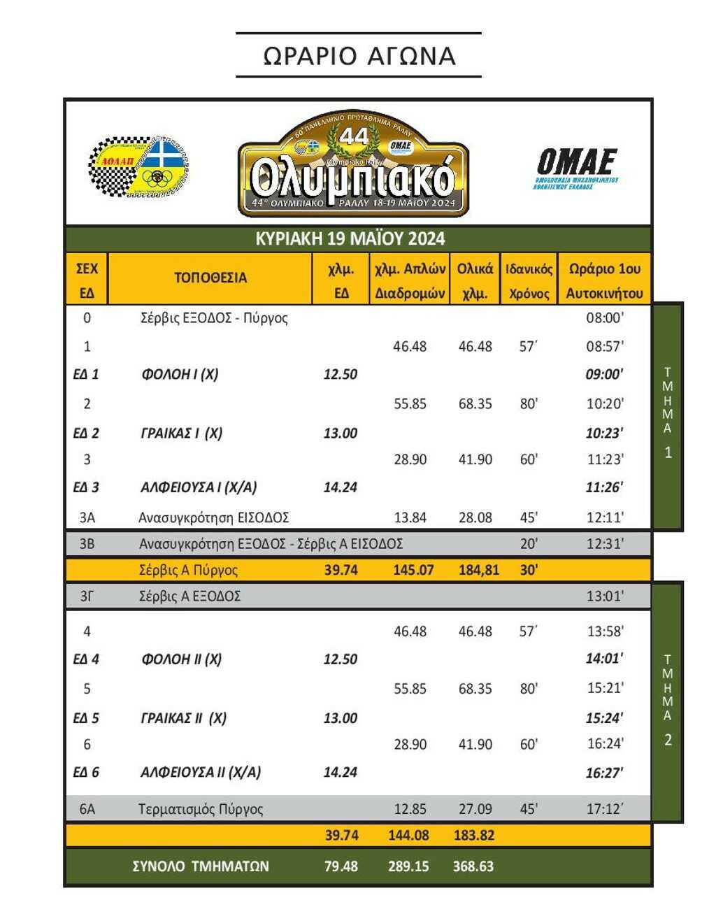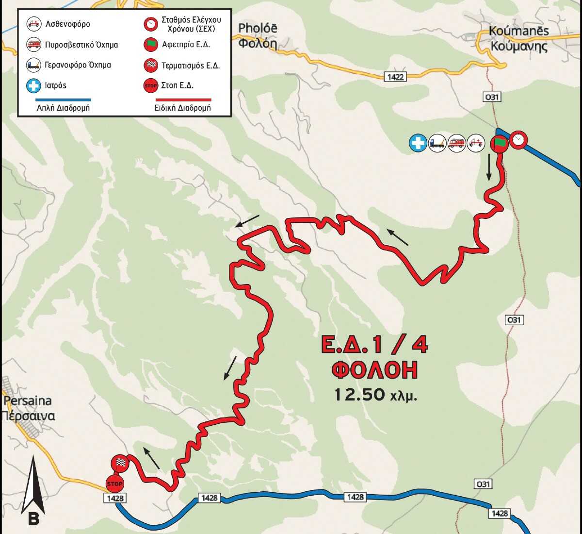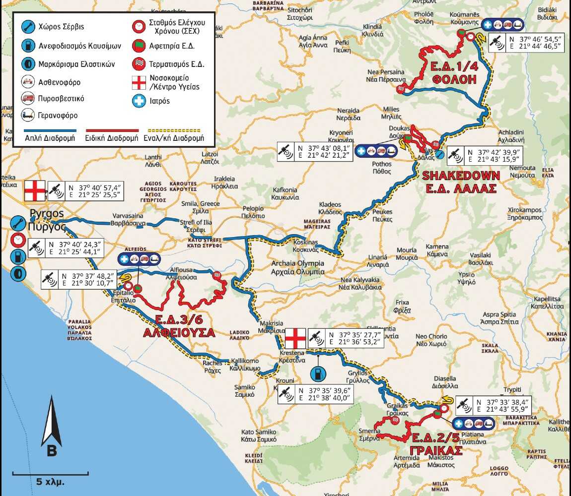 Ο αγώνας αποτελείται από 6 ειδικές διαδρομές συνολικού μήκους 79,48 αγωνιστικών χιλιομέτρων. Τα αγωνιστικά το πρωί της Κυριακής θα κατευθυνθούν στην Ειδική Διαδρομή “Φολόη” (μήκος 12,50 χιλιομέτρων), η οποία θα πραγματοποιηθεί δύο φορές, ενώ δύο φορές θα διέλθουν και από την Ειδική Διαδρομή “Γραίκα” (μήκος 13,01 χιλιόμετρα), η οποία χρησιμοποιήθηκε στο τελευταίο Rally Sprint που διοργάνωσε η ΑΟΛΑΠ τον περασμένο Νοέμβριο. Τελευταία ειδική του πρώτου loop και του αγώνα θα είναι η “Αλφειούσα” (μήκος 14,24 χιλιόμετρα), με διαφορετική χάραξη σε σχέση με τα προηγούμενα χρόνια. Τα συνολικά χιλιόμετρα του αγώνα ανέρχονται σε 368,63, με 289,15 χιλιόμετρα απλών διαδρομών.