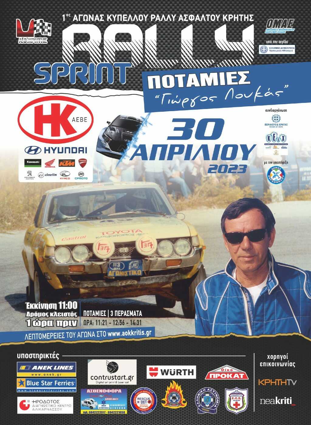 Ο Χαρίδημος Στιβακτάκης θα πραγματοποιήσει την αγωνιστική επάνοδο στη θέση του οδηγού έπειτα από σχεδόν 20 χρόνια, με τον Λευτέρη Θεοδωράκη να τον καθοδηγεί. Ο φετινός αγώνας ονομάζεται “Γιώργος Λουκάς” προς τιμήν του παλαιού αγωνιζόμενου, οδηγού, φίλου, και μέλος του ΑΟΚρήτης που έφυγε ξαφνικά από κοντά μας πριν μερικούς μήνες. Ο αγώνας θα διεξαχθεί στην ομώνυμη διαδρομή “Ποταμιές-Ασκοί” 11,15 αγωνιστικών χιλιομέτρων, στην οποία τα πληρώματα θα διαγωνιστούν τρεις φορές.