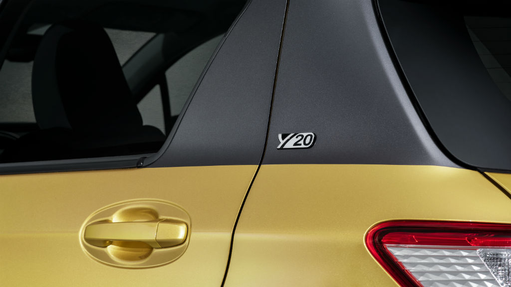 Το Y20 θα διαθέτει το πρώτο χρυσό χρώμα που είχε το Yaris του 1998, όμως αυτή τη φορά θα υπάρχει και δεύτερο χρώμα στην οροφή, το οποίο θα είναι το σκούρο γκρι. Η διχρωμία αλλάζει και τη μάσκα, τους προβολείς ομίχλης και τα καπάκια των καθρεπτών, ενώ η εξωτερική εμφάνιση ολοκληρώνεται με τις ζάντες αλουμινίου μεγέθους 16”, με 10 ακτίνες και σκούρο γκρι χρωματισμό. Στο πίσω μέρος ξεχωρίζει η αεροτομή της οροφής και το λογότυπο Y20 που κάνει το μοντέλο να ξεχωρίζει αμέσως.