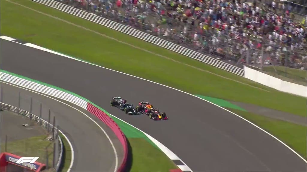 Σβήνοντας τα 5 κόκκινα φώτα και ενώ όλα έδειχναν πως θα έχουμε μια εντυπωσιακή μάχη ανάμεσα σε Verstappen και Hamilton, με τους δύο οδηγούς να μάχονται σκληρά, τελικά η επαφή του Βρετανού με την πίσω δεξιά πλευρά του Ολλανδού, έστειλε τον Verstappen στις μπαριέρες και εκτός αγώνα, αφού κατέρρευσε αμέσως η ανάρτηση. Ο Charles Leclerc λίγο πριν είχε περάσει τον Valtteri Bottas ανεβαίνοντας τρίτος, ενώ μετά το συμβάν βρέθηκε να οδηγεί την κούρσα.