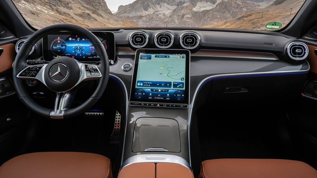 Στο εσωτερικό δεν αλλάζει τίποτα σε σχέση με την C-Class, με τις δύο μεγάλες ψηφιακές οθόνες να τραβάνε αμέσως τα βλέμματα. Η μία είναι για τον πίνακα οργάνων και η άλλη είναι αφής με το σύστημα ενημέρωσης και ψυχαγωγίας MBUX. Τα δερμάτινα καθίσματα και το δερμάτινο τριάκτινο τιμόνι, με τα χειριστήρια ανεβάζουν τον πήχη της πολυτέλειας. Ο χώρος αποσκευών φτάνει τα 490 λίτρα, ενώ με την αναδίπλωση των πίσω καθισμάτων ανεβαίνει ακόμη περισσότερο.