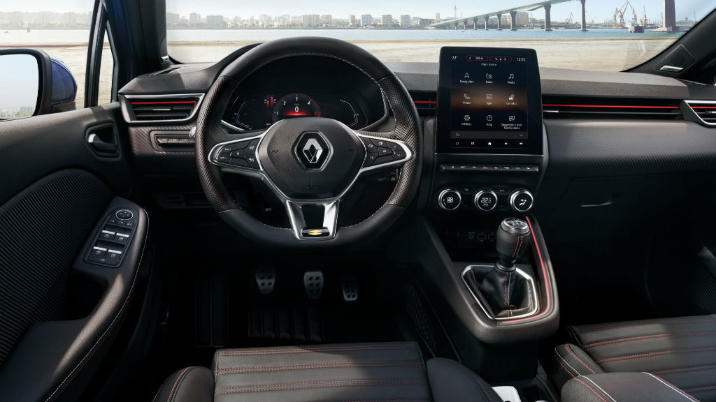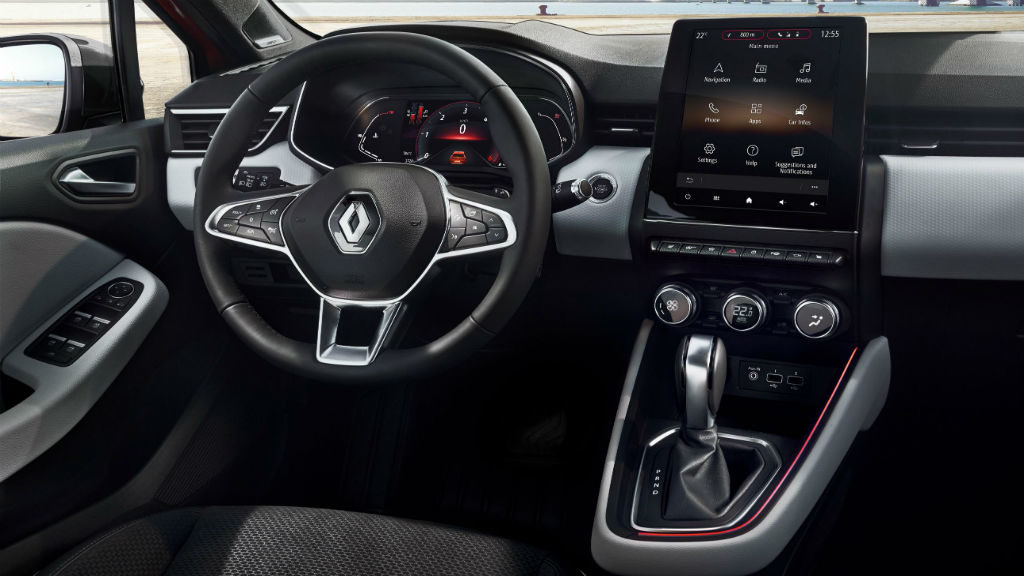 Το ταμπλό πλέον απεικονίζεται στη νέα οθόνη μεγέθους από 7” έως 10”, που αντικαθιστά την παραδοσιακή αναλογική οθόνη. Έτσι το Clio με τις δύο οθόνες μεγέθους 9,3” και 10” είναι αυτό με τις μεγαλύτερες οθόνες στην κατηγορία του. Τα μαύρα δερμάτινα καθίσματα με τις κόκκινες ραφές δίνουν μια μεγαλύτερη αίσθηση πολυτέλειας, ενώ το τριάκτινο τιμόνι με τα χειριστήρια και ο δερμάτινος επιλογέας ταχυτήτων συμπληρώνουν το πολυτελές κομμάτι του εσωτερικού.