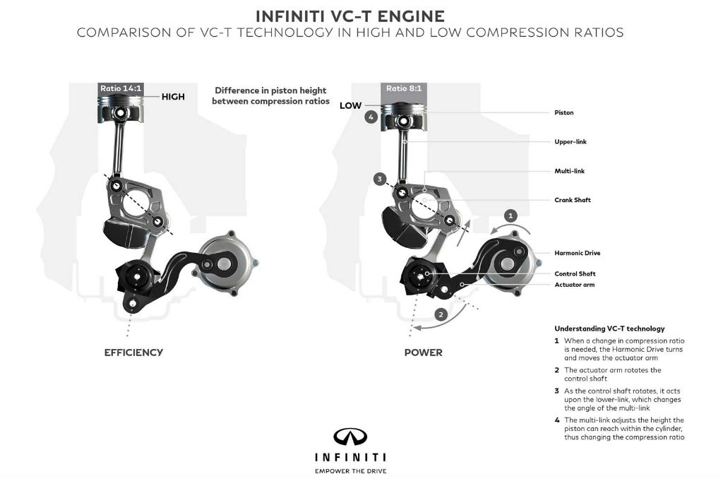 Η τεχνολογία VC – T σημαίνει ένα νέο κεφάλαιο στην ιστορία των μηχανών εσωτερικής καύσης, η οποία δεν περιορίζεται πλέον από ένα σταθερό λόγο συμπίεσης. Η εφευρετικότητα της τεχνολογίας των κινητήρων VC – T έγκειται στην ικανότητά της να μεταμορφωθεί και απρόσκοπτα να αυξήσει ή να μειώσει το ύψος των εμβόλων. Κατά συνέπεια, η μετατόπιση των αλλαγών του κινητήρα και ο λόγος συμπίεσης μπορεί να ποικίλει μεταξύ 8:1 και 14:1 για υψηλή απόδοση.