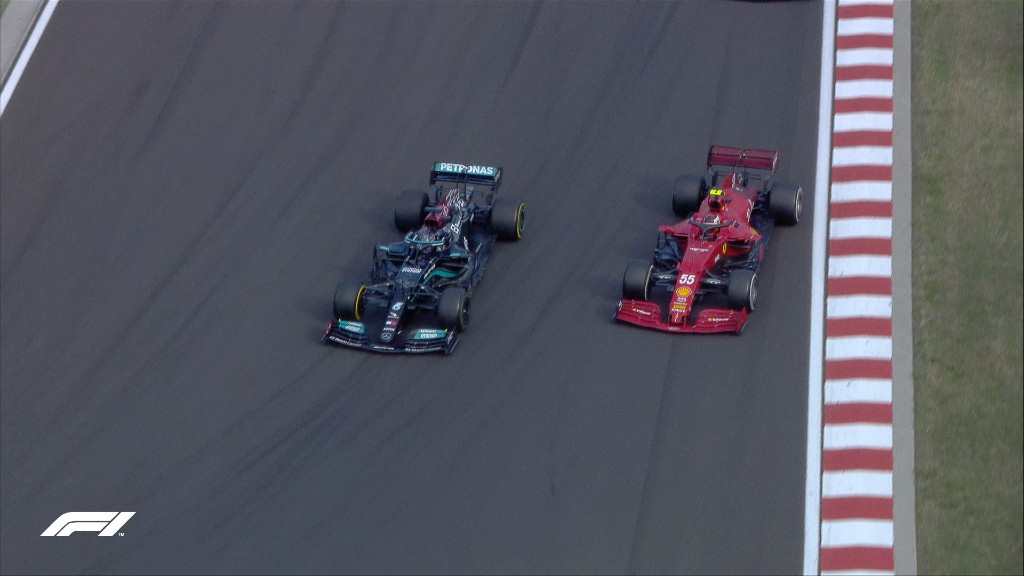 Η κατάσταση της πίστας έφερε τους πιλότους στην εκκίνηση με ενδιάμεσα ελαστικά, αφού υπήρχε βροχή με τον Giovinazzi να παίρνει το ρίσκο για σλικ ελαστικά ξεκινώντας από το pit lane. Σβήνοντας τα 5 κόκκινα φώτα ο Hamilton έφυγε κανονικά πρώτος, με τον Bottas και τους υπόλοιπους να γλιστράνε. Ο Norris βρέθηκε μπροστά από τον Bottas όπως και ο Verstappen. Στο φρενάρισμα της πρώτης στροφής ο Bottas ακούμπησε τον Norris που με τη σειρά του έπεσε στον Verstappen, ενώ ο Bottas χτύπησε τον Perez.