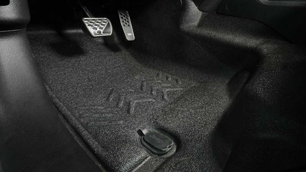 Το πρώτο από αυτά είναι ένα νέο πάτωμα από αντιολισθητικό πλαστικό υψηλής αντοχής, το οποίο καλύπτει το εσωτερικό και κάνει εξαιρετικά εύκολο τον καθαρισμό του, ακόμα και από λάσπες. Η σχεδίαση του καλύμματος αξιοποιεί επίσης τις οπές στράγγισης με τις οποίες είναι εφοδιασμένα όλα τα Wrangler. Το ανθεκτικό πάτωμα είναι αποκλειστικά διαθέσιμο σε μαύρο χρώμα και αποτελείται από πολλές στρώσεις οι οποίες παρέχουν μόνωση από τον εξωτερικό θόρυβο και τη ζέστη.